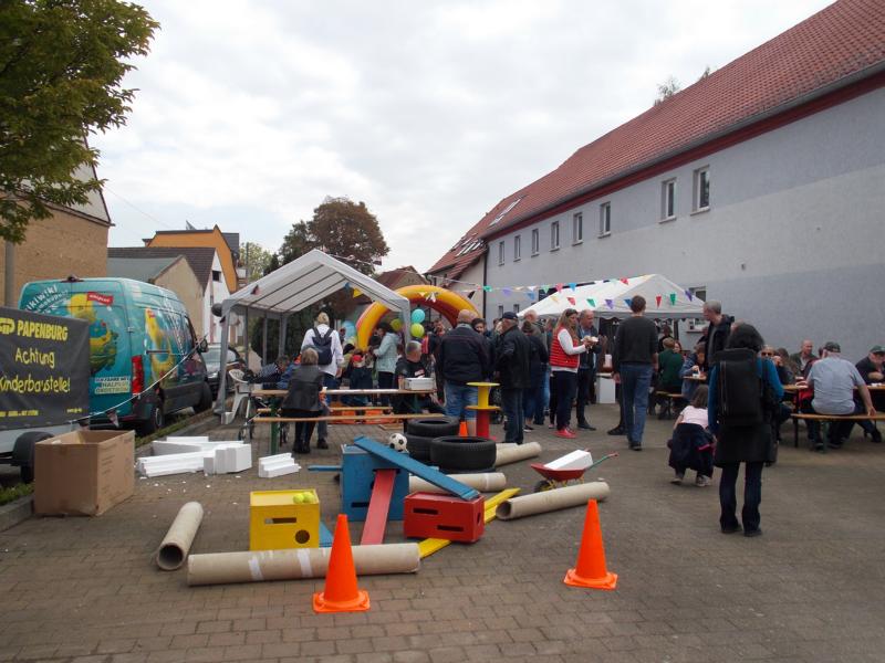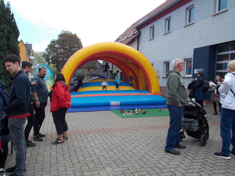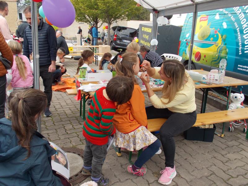 gemeinsam organisiert von der Kirchengemeinde St. Pankratius und dem Verein “Wir für Mötzlich“ e.V. . In diesem Jahr gab es, nicht wie gewohnt, keine Spielekarten für die Kinder, sondern eine Kinderbaustelle. Mit Blöcken, Brettern und Rohren konnte gebaut werden. Dabei sollten wir feststellen, die Ideen der Kinder waren grenzenlos. Dann konnten sie weiter zur Hüpfburg von WikiWiki gehen und sich dort austoben. Einige Spiele, wie Enten angeln oder Büchsen werfen, hatten wir zum Zeitvertreib aufgebaut. Bei Edda und Antje konnte man sich in einen Fuchs, eine Fee, einen Schmetterling oder andere Figuren verwandeln lassen. Wer Hunger hatte, konnte sich am Imbiss mit selbst geriebenen Kartoffelpuffern (aus 15 kg Kartoffeln), Bratwurst, Currywurst oder Folienkartoffeln stärken. Wer Lust auf Süßes hatte konnte zwischen Zuckerwatte und frisch gebackenen Waffeln wählen. Auch das Eis-Auto der Fa. Meloni parkte pünktlich ein. Schließlich war inzwischen schönster Sonnenschein. Es gab eine kleine Tombola mit 200 Preisen. Der Hauptpreis, eine Heißluftfritteuse, wechselte den Besitzer.